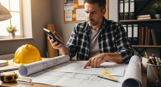 Alt tag: construction estimating professional reviewing project drawings